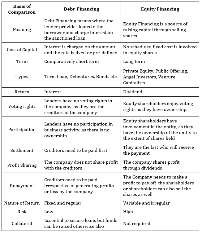 As per the above differentiation between Debt and Equity Financing, an entity can choose a source of funding as per their need. Both the sources of financing have their merits and demerits.